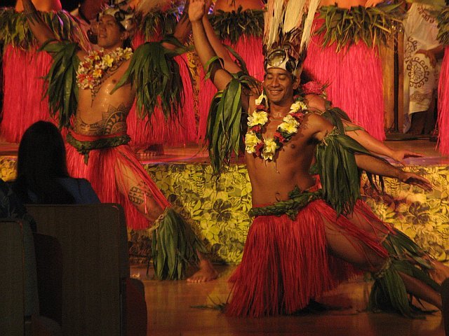 Men also dance, but more often they are the musicians—especially drummers. One male dancer (below) was especially notable for the tattoos on his torso and thigh. Tattoos are ubiquitous as body art in the South Pacific. Shell and flower leis and crowns are also popular.