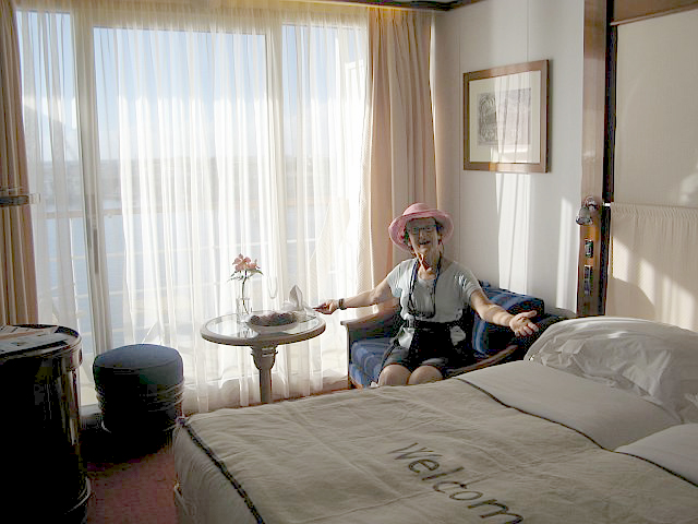Entering the ship, I pause below a banner that shows the stages of an eclipse (right), from the first bite taken out of the sun, through the sun's shrinking to a crescent, to totality, and then reversing the sequence. Soon after boarding, I sit while Carol memorializes our neat-as-a pin shared stateroom (below)—which never looked this tidy again.