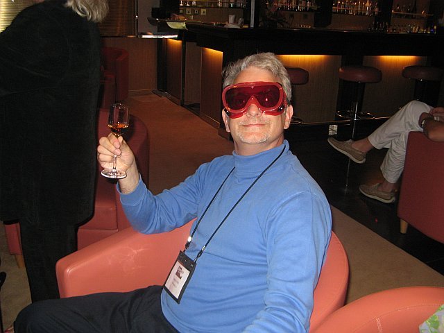 Landon Noll, raising his glass of after-dinner cognac, wears goggles to