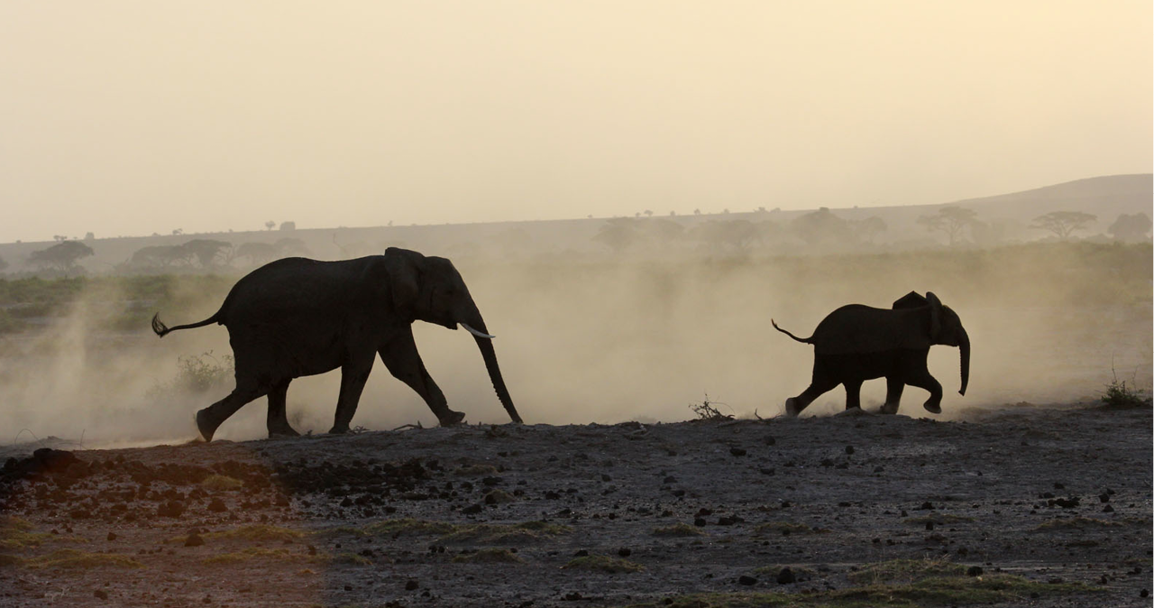 Mother elephant chasing child, with dust stirred up, and coating animals. The coating of dust on elephants is for cooling--helps keep sun off the skin. Photo by Bob Stephens.