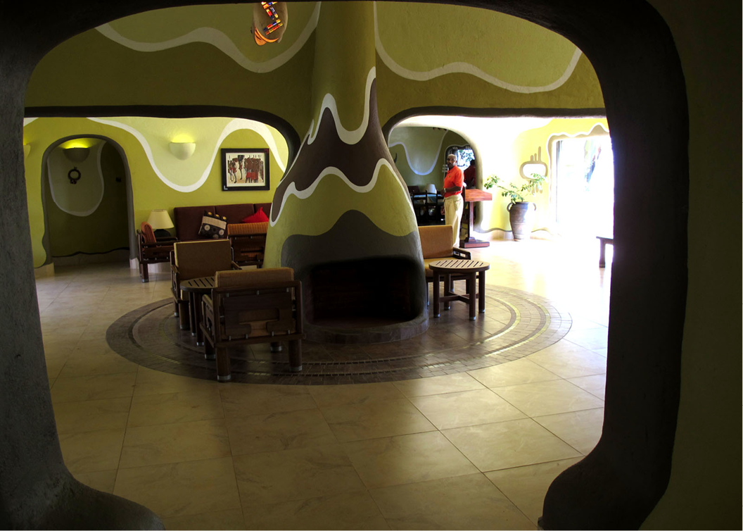 Lobby of lodge, in colors specified by architect Gaudi. Photo by Bob Stephens.